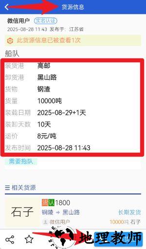4、在货源信息页面,用户可查看货主发布的详细信息,包括装卸港口、运价、装卸天数等,并可直接联系货主。