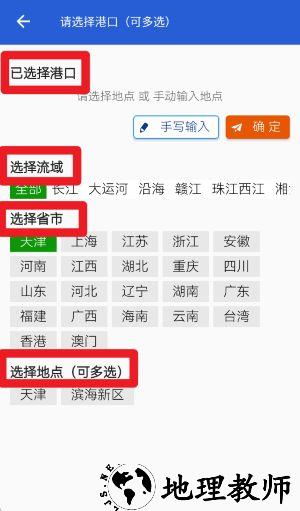 3、在选择港口页面,用户可按流域、省市和具体地点筛选港口,支持多选操作,方便匹配货源与船期需求。