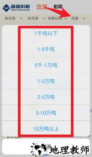 5、在船期筛选界面,用户可以按装卸港、日期及货量等条件筛选合适船期,提升船货匹配效率。