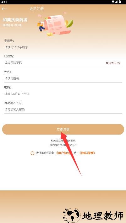 1、在注册界面输入手机号和验证码,输入姓名并设置密码后点击立即注册即可。
