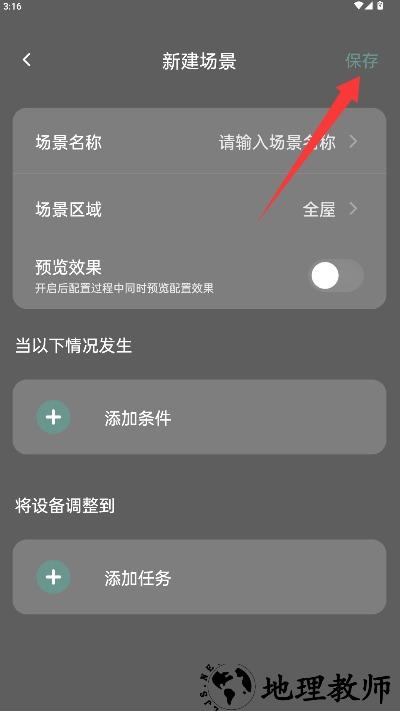 4、输入场景名称、场景区域、是否开启预览效果,添加条件和任务后保存即可。