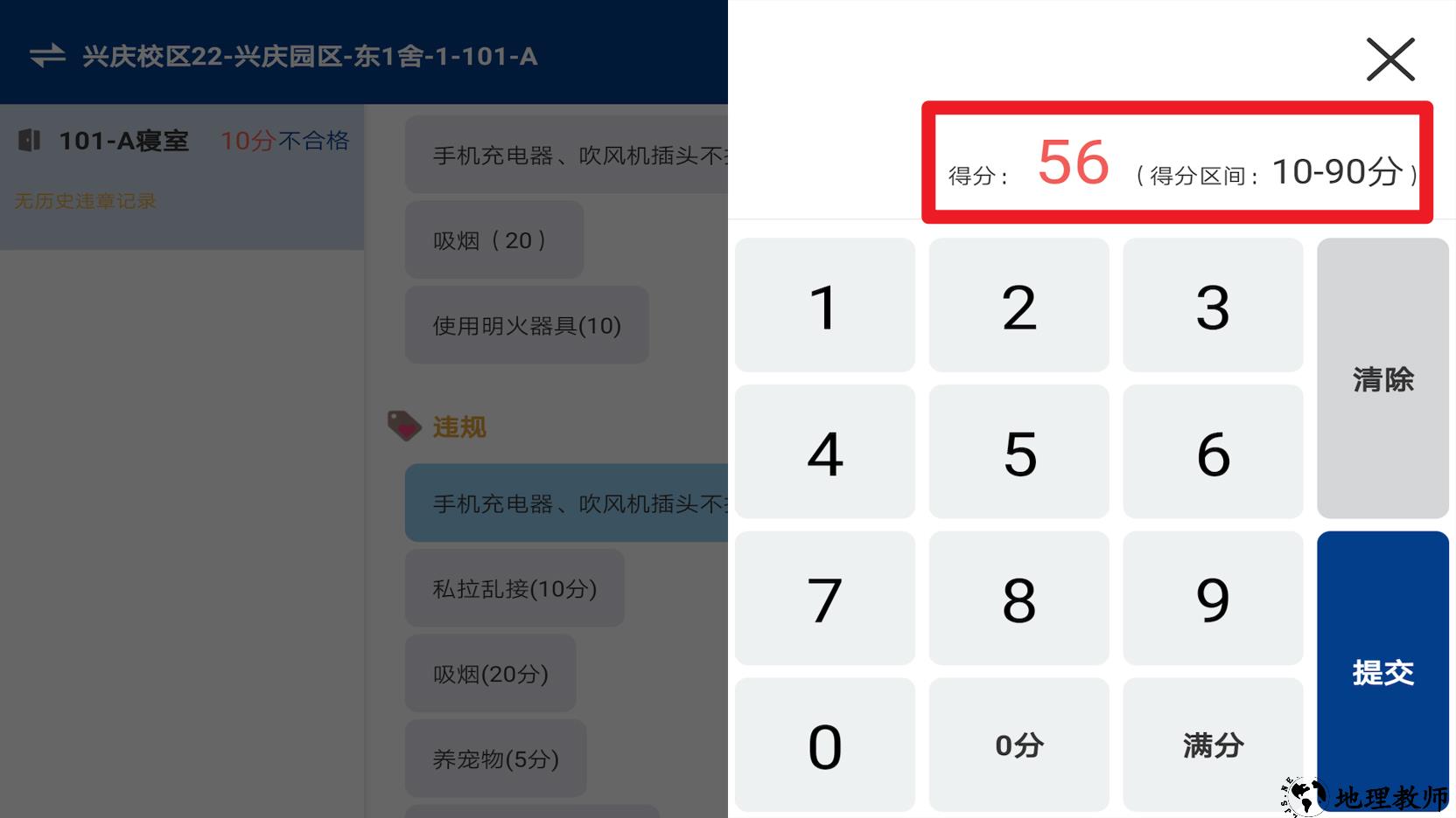 4、选择某一房间进入评分界面后,可以根据寝室情况输入对应分值,确保得分处于规定区间内,最后点击提交完成操作。