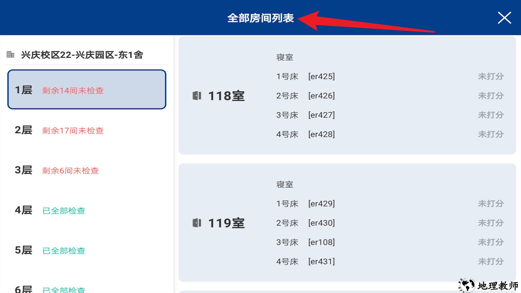 3、点击全部房间列表即可进入具体宿舍楼层及房间详情,显示未检查或已检查的状态,帮助管理人员高效掌握查寝进度。
