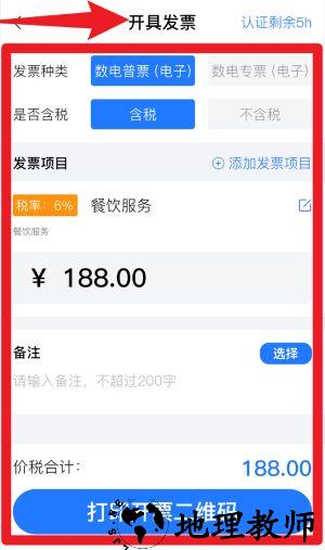 4、在开具发票页面中填写发票类型、项目名称、金额及税率后,点击底部按钮即可生成发票二维码。