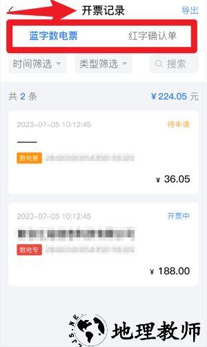 5、点击开票记录可查询所有已开具的蓝字或红字发票,支持按时间、类型筛选查看历史发票明细。
