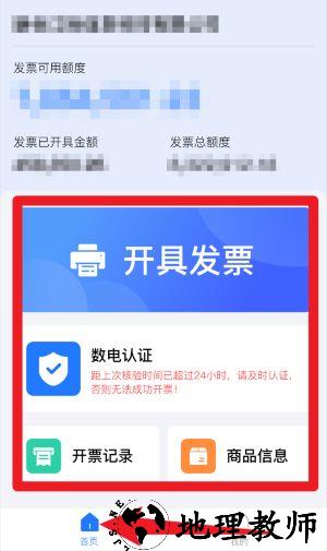 3、进入首页后点击开具发票按钮可创建新发票任务,并查看发票记录和商品信息等常用功能入口。