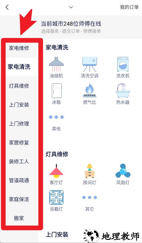 3、在服务分类页面,用户可以选择家电维修、家电清洗、上门安装、家庭保洁等不同项目,便于精准下单。
