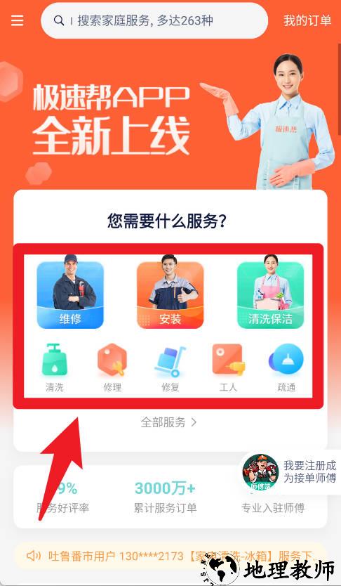 2、在首页功能区,用户可以根据需求选择维修、安装、清洗保洁等服务类别,快速找到所需的服务入口。