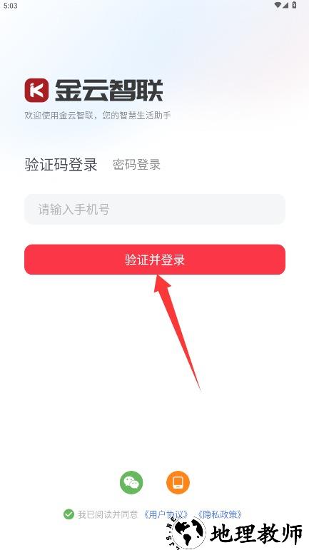 2、输入手机号,勾选同意相关协议后点击验证码并登录按钮输入验证码登入。