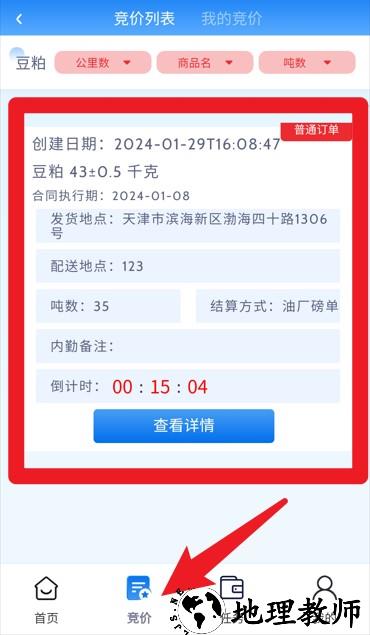 3.点击底部导航栏竞价按钮,进入竞价列表,查看各项竞价详细信息。