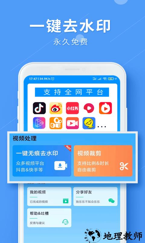 2.支持多个第三方视频应用程序以删除视频的水印功能,易于操作。