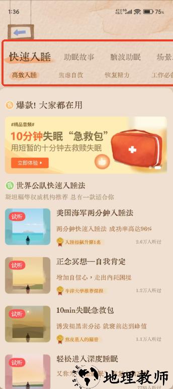3、【世界公认快速入睡法 总有一款适合你】:包含 3 分钟入睡练习,助力睡意自然降临;提供多种世界公认的快速入睡方法,如美国海军两分钟入睡法、YogaNidra 古印度入睡法、Savanna 催眠术,以及针对烦躁失眠、压力型失眠的练习和腹式呼吸助眠法。