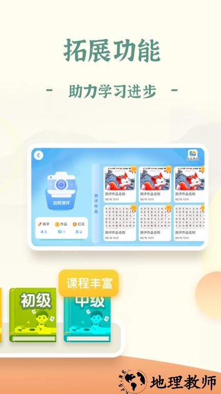 1、秉承了小学书法教学的标准和原则,能够覆盖孩子们书法启蒙教育的各个方面;