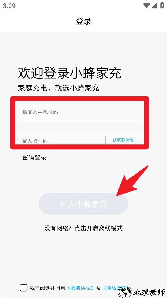 1. 打开App后进入登录页面,输入手机号和验证码,点击下方的进入小蜂家充按钮完成登录操作。
