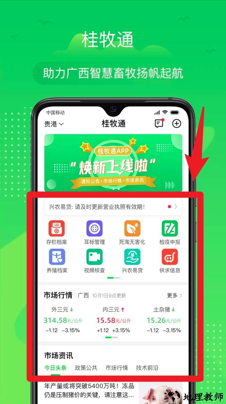 1. 打开APP进入首页,可查看存栏、耳标、检疫等功能入口,也能浏览市场行情与农业资讯。