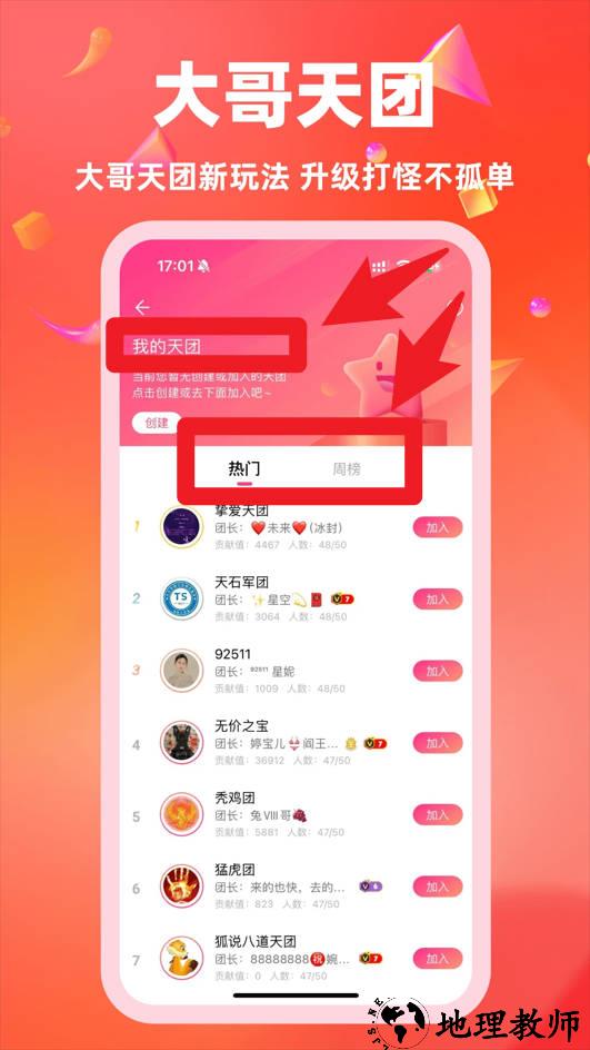 3、于我的天团页面,用户可选择加入自己喜爱的粉丝团,与团员一起完成任务,享受更多互动乐趣与团队荣誉感。