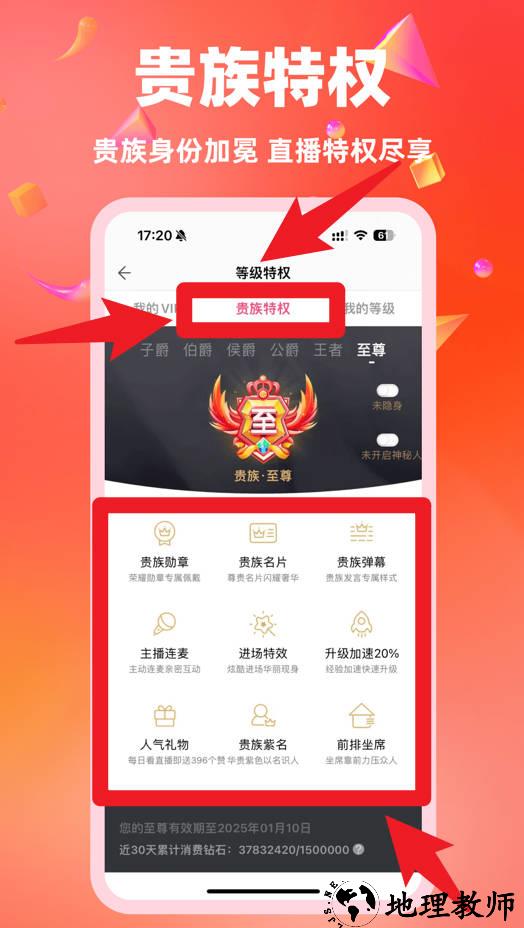 5、点击等级特权页面中的贵族特权栏,即可查看贵族身份所享权益,包括贵族勋章等多项直播互动特权。