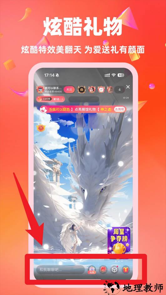 4、在直播间底部输入框中可与主播实时互动聊天,也可通过赠送礼物提升活跃度。