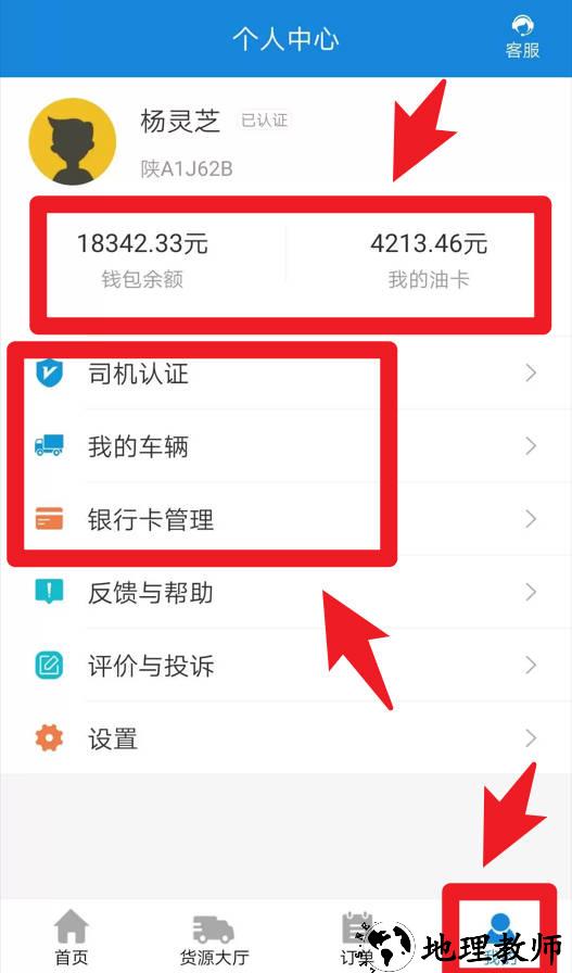 5、个人中心页面展示司机钱包余额、油卡金额,还能进行车辆管理、银行卡绑定和身份认证。