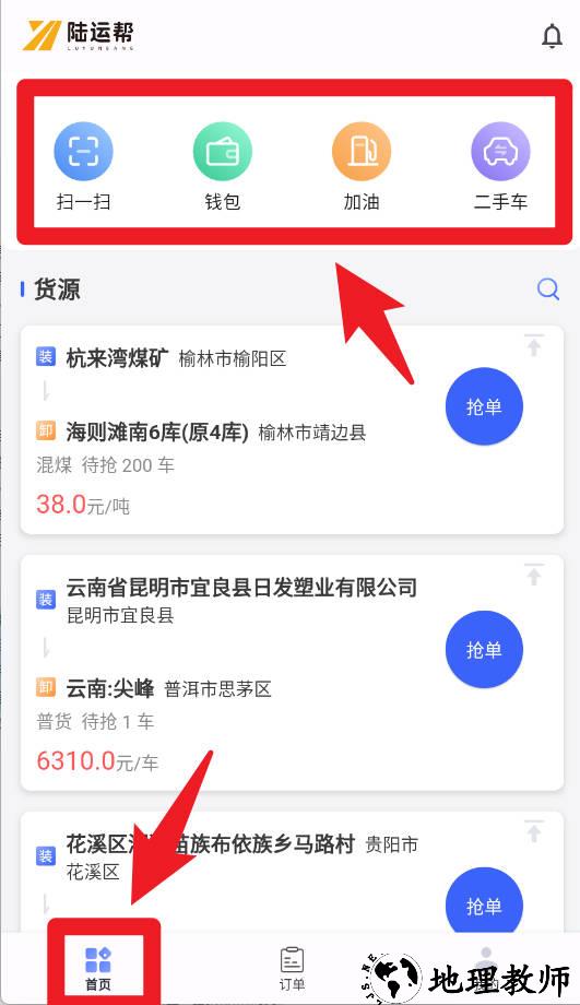 2、首页为司机提供扫一扫、钱包、加油和二手车等便捷功能,同时展示货源信息。