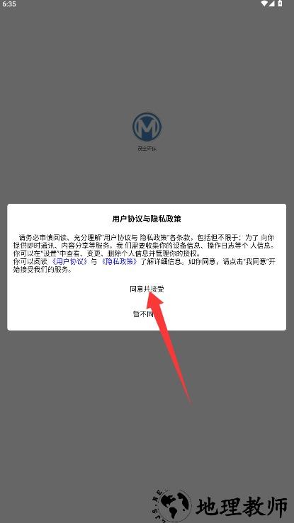 1、初次使用需阅读平台服务条款与隐私政策,确认后点击同意并接受按钮进入。