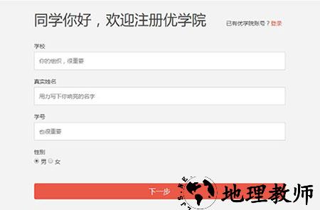 1、在对应平台下载优学院软件,安装完成后打开,进入注册页面,先填写学校、学号、性别和真实姓名;