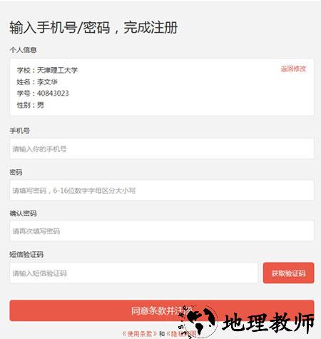 2、接着填写手机号与密码,输入短信验证码,点击【同意条框并注册】按钮;