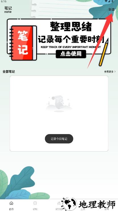 1、进入应用首页后点击笔记功能模块,选择右上角新建按钮开始创建笔记内容。