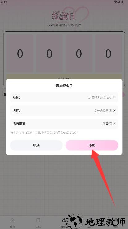 4、输入纪念日名称标题、具体日期及置顶设置选项,确认后即可成功添加纪念日记录。