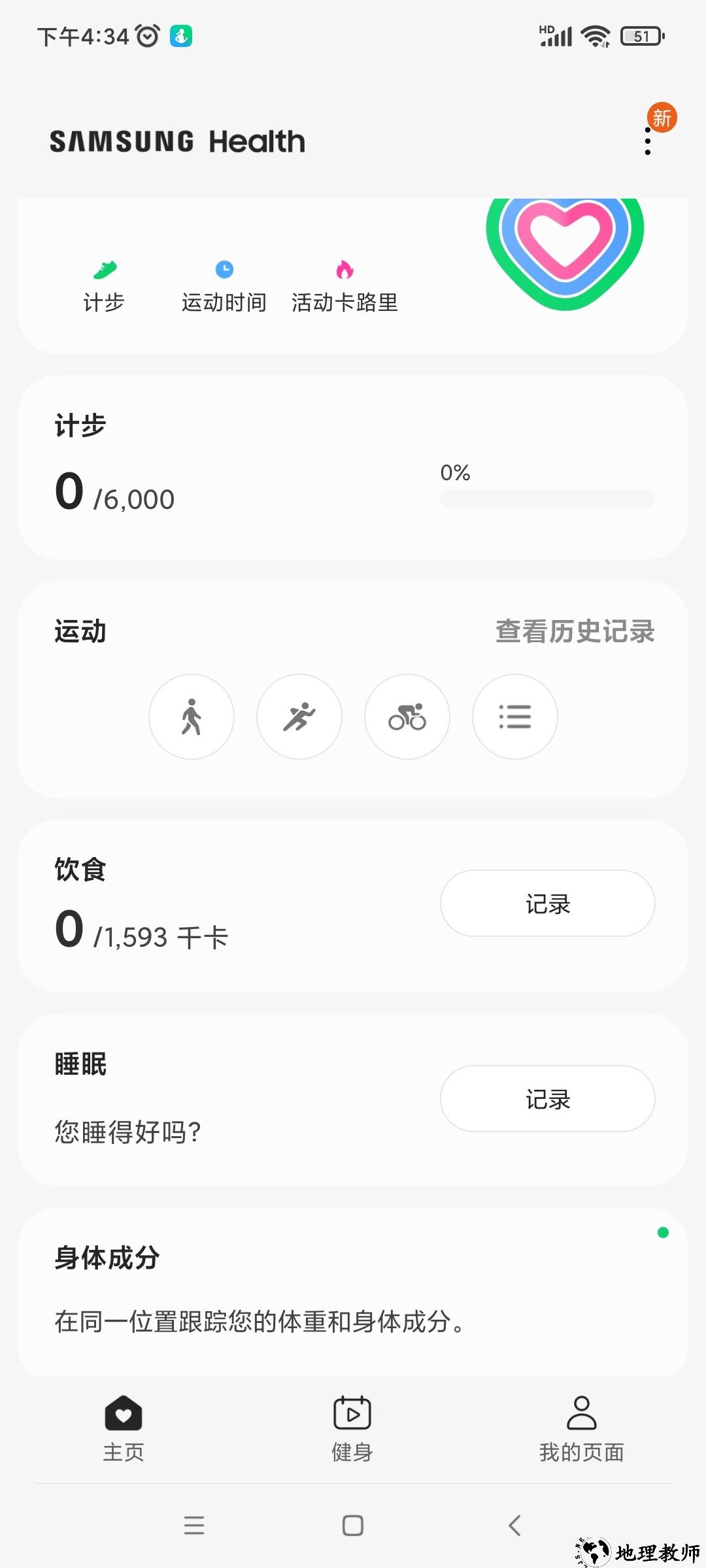 1、在本站下载安装三星健康监测器,运行软件进入首页,可查看步数、运动、饮食、睡眠质量等信息。