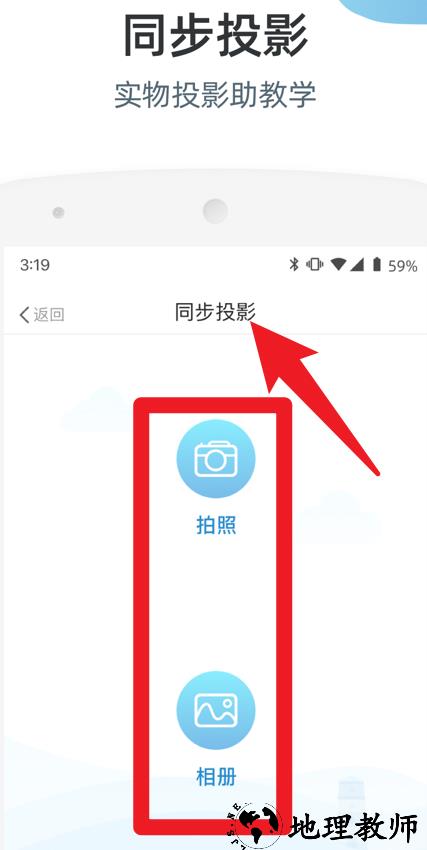 5、在首页选择同步投影功能,用户可通过拍照或从相册中选择图片,实现实物投影辅助教学,让课堂展示更加直观。
