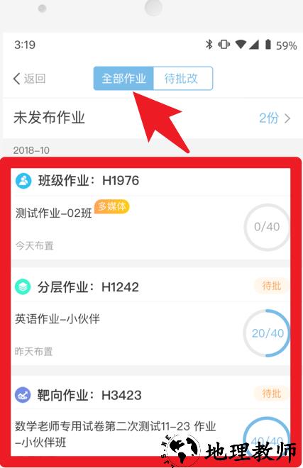 4、在作业管理模块,老师可以查看所有布置的作业,支持班级作业、分层作业和靶向作业的批改与统计。