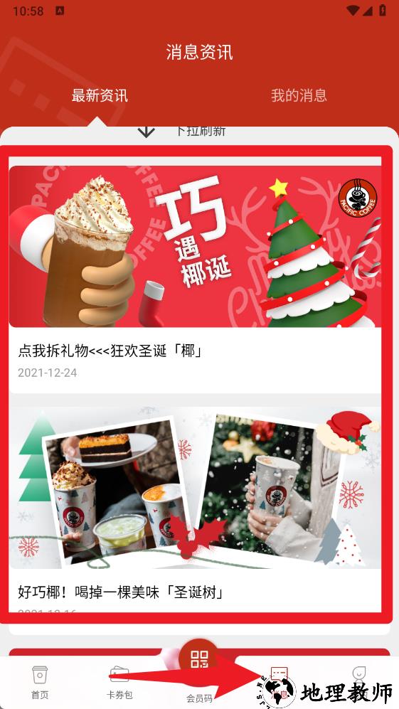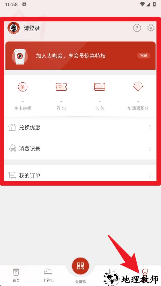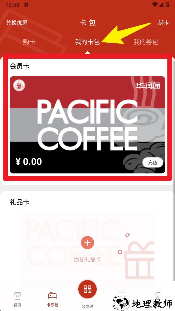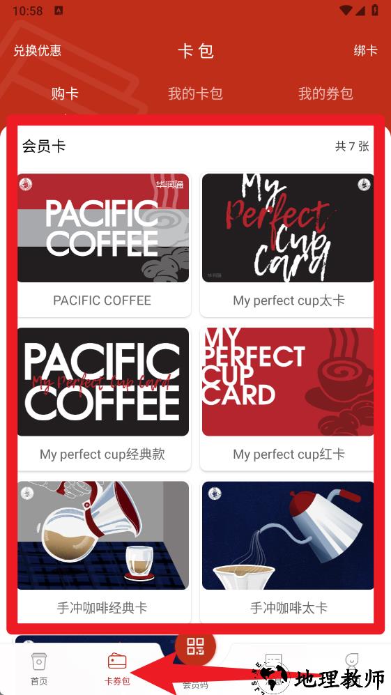 3、点击卡券包进入会员卡专区,可以购买、查看和管理各种咖啡会员卡。