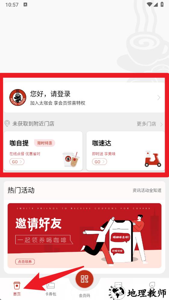 2、首页为主要功能区,支持咖啡自提、咖速达外送以及查看最新活动与优惠资讯。