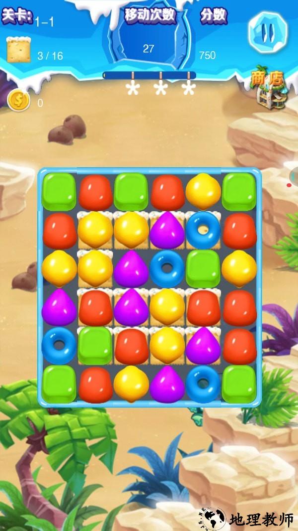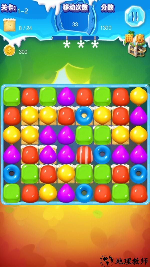 整个色彩鲜艳的画面就很吸引人,使用了道具或者合成出炸弹后,产生的特效也很有意思,后面的关卡会越来越难,一定要去兑换道具才能通关哦。