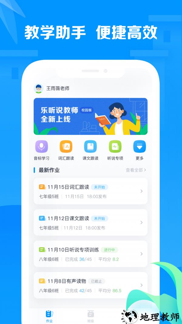 想要在线更加高效地管理学生就来《乐听说教师》APP吧,用这款软件专为教师打造,能够方便老师更加快速地管理自己的学生,还能在线批改作业、布置作业以及发布通知和公告等,节省老师的时间,提高老师的工作效率,同时还提供多种学习资源,帮助孩子学习。