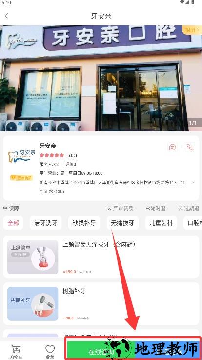 4、选择目标诊所查看服务项目详情,通过在线或电话方式咨询专业牙科问题。