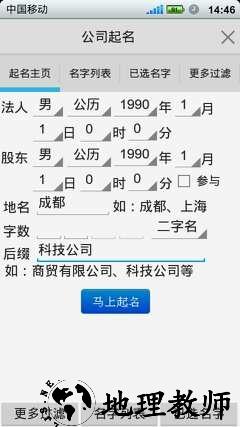 《如意公司起名软件安卓版》(目前:稀有软件支持法人和股东一起搭配起名,是公司起名软件中的佼佼者)你只需要输入法人及股东的基本信息、公司地名(如:成都市)、公司名后缀(如:起名公司)、选择名字类型起二字或三字或四字名字等、也可以固定其中任何一个文字搭配,即可自动在数秒之内生成10000以上的高分名字。你可以轻松选出好听,满意的好名字,另外可以测算公司名字详细分析及打分。