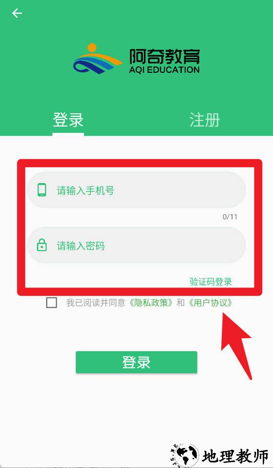 1、在登录界面,需输入手机号和密码进行登录,可选择验证码登录方式,登录前需同意隐私政策和用户协议。