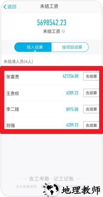 4、未结工资功能支持按人或按项目结算、管理人员可直接查看工友的工资情况、提高工资发放效率。