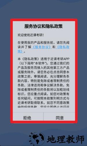 1、首次进入近课考研app时,系统会弹出服务协议和隐私政策提示,用户需认真阅读并选择同意方可继续使用。
