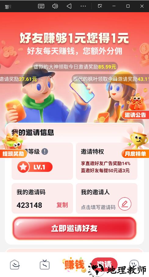 复制邀请码:在“邀请”页面复制你的 专属邀请码(如:423148)。