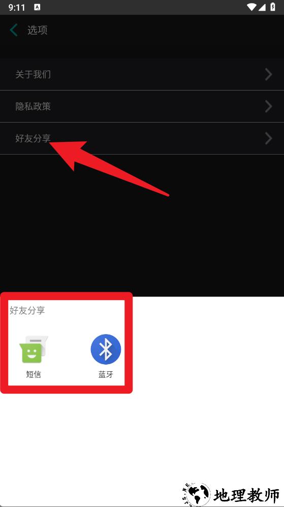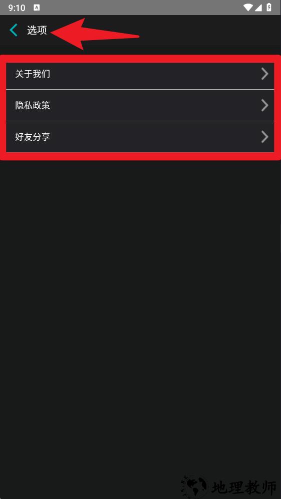 3、在选项页面,用户可以进入关于我们、隐私政策、好友分享等模块,轻松获取信息与分享应用。