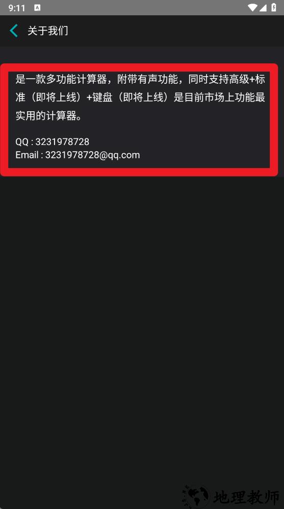 5、打开软件后,在关于我们页面可以查看应用功能简介以及联系方式,便于用户了解这款计算器的主要特色。