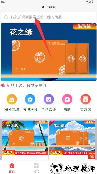 3、在首页商城顶部搜索栏输入商品名称或相关关键词,搜索需要的商品进行浏览。
