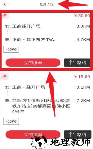 5、任务大厅聚合展示不同订单信息,包含发货地、收货地、距离与价格,用户可根据距离与报酬选择合适任务。