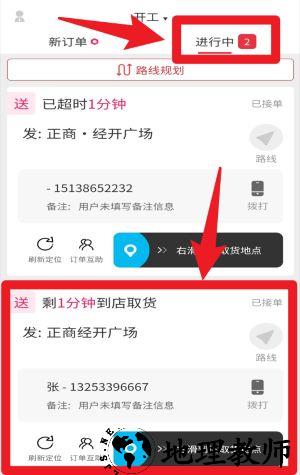 4、订单会显示在新订单或进行中页面,可点击进行中的订单,实时查看超时、预计到达时间等信息。