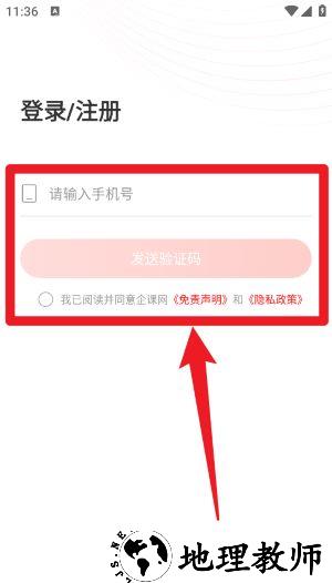 2、在注册页面输入手机号并勾选同意协议后,点击发送验证码完成验证即可快速登录平台。