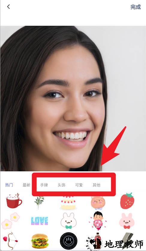 3、在贴纸功能界面,可以为照片添加手牌、头饰、可爱元素等多种风格的贴纸,让图片更有趣味性和吸引力。
