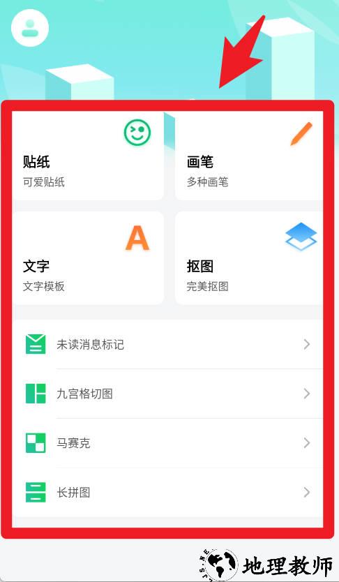 1、在功能主页,户可以选择贴纸、画笔、文字或抠图功能,能使用九宫格切图工具满足不同的图片处理需求。